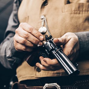 И где-то году в 2014–2015 в журнале «Популярная механика» мне попалась статья про такую дисциплину, как Fast Draw — дословно «скоростное выхватывание». Это одна из ветвей ковбойской стрельбы. Все мы помним, как в вестернах ковбои моментально выхватывают револьвер из кобуры и стреляют, не целясь, прямо от бедра. У многих наверняка возникал вопрос, можно ли вообще так куда-то попасть. Так вот эта дисциплина как раз на этот вопрос отвечает, так как представляет из себя стрельбу на время от бедра в различные виды мишеней. У нее есть свои особенности. Во-первых, очень маленькая дистанция выстрела: не более семи метров. Во-вторых, в целях безопасности не используются «боевые» патроны. Оружие настоящее, но оно стреляет восковой пулей при стрельбе по стальным мишеням или заряжается холостым зарядом на черном порохе, так как на маленькой дистанции черный порох не успевает полностью сгореть и его частички попадают в мишень, которой служит воздушный шарик. Он лопается и размыкает контакт таймера. Спорт получается очень демократичным, так как из-за отсутствия патронов цена выстрела оказывается на уровне пневматики.