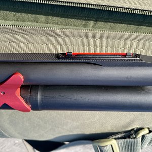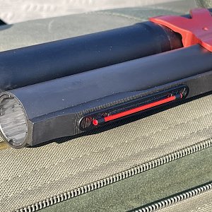 Длинный магазин на 13 патронов, увеличенная кнопка затворной задержки, большая и яркая рукоятка затвора, складной целик для пулевой стрельбы, яркая оптоволоконная мушка и, конечно же, фантастический кронштейн магазина в виде большого красного «икса».