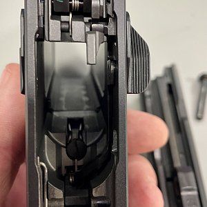 Следующим предметом обновленного внешнего вида является педаль под большой палец слабой руки. Вариантов педали чехи предложили несколько, под разные типы рук и размеры пальцев. Это очень здорово, так как универсальные педали, присутствующие на рынке, в основном очень корявые и требуют серьезной доработки в случае установки на TS. Мы видели десяток различных, совершенно безумных конструкций от всяких «кулибиных» и «самоделкиных», но предыдущий дизайн пистолета был совершенно не предназначен для установки сторонних устройств, и это всегда выглядело некрасиво и работало плохо. То ли дело новый «Чиж». Вариант пистолета, предусматривающий установку педали, уже сразу имеет фрезерованную площадку для этой цели и отверстия с резьбой для крепления. Эту опцию Чешская Зброевка распространила и на старые модели, которые до сих пор еще идут на рынок. Чувствуется влияние Эрика Грауфеля после его прихода в CZ и проделанной работы в отделе маркетинга и инженерии.