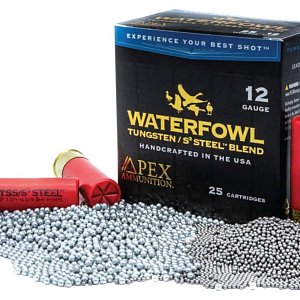 Линейка нетоксичных патронов премиум-класса компании Apex расширяется за счет выпуска новых смесей TSS/S3. Эти дуплексные патроны содержат высокоплотную дробь премиум-класса № 7,5 TSS с оцинкованной стальной дробью Apex. Дробь TSS имеет плотность 18,1 г/куб. см, что значительно выше, чем у свинца, и в сочетании с однородной оцинкованной стальной дробью Apex (№ 2, 4 или BB в 12 калибре, № 4 в 20 калибре) этот смешанный заряд обеспечивает превосходную летальность и снижает количество ранений. Эти патроны содержат порох высшего качества и цельные пыжи из вольфрама, которые защищают внутреннюю поверхность ствола, что делает их отличным вариантом для серьезных охотников на водоплавающую дичь.