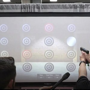 В комплекте с этими замечательными устройствами также предлагается интерактивный тир. Проектор проецирует на стену или белый экран тренировочные задания, группы мишеней, подвижные цели и прочие упражнения, а сканер считывает отметки лазерного луча и меняет сценарии в зависимости от попаданий.