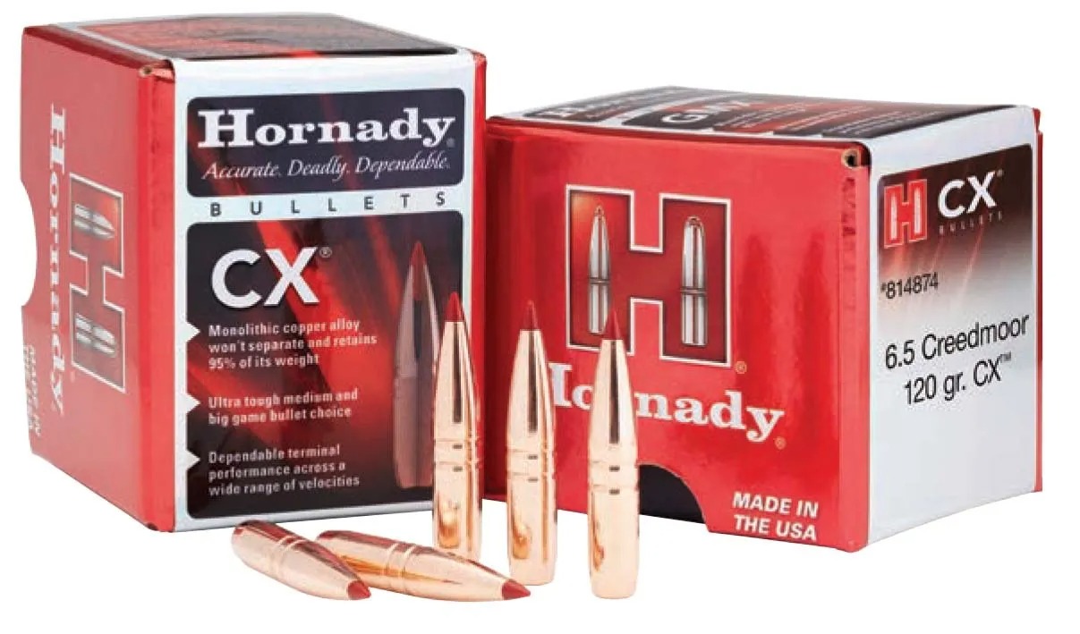 Новейшая охотничья пуля компании Hornady — CX (медно-сплавная экспансивная). CX — это монолитная пуля из медного сплава, которая подходит для охоты на разнообразную дичь на различных дистанциях. Независимо от того, где вы охотитесь, новая пуля CX является превосходным вариантом, поскольку пули обеспечивают отличную точность и сохраняют 95 % своего первоначального веса. Пули имеют канавки на хвостовике, которые улучшают характеристики, снижают нагар и уменьшают поверхность. Они также оснащены полимерным наконечником Heat Shield компании Hornady, который улучшает аэродинамику, снижает нагрев и обеспечивает стабильное качество от пули к пуле и от партии к партии, что необходимо серьезным стрелкам на дальние дистанции. Патроны, снаряженные пулями CX, доступны в линейках Outfitter, Superformance и Custom компании Hornady в широком диапазоне патронов от .223 Remington до .375 H&H Magnum. Компонентные пули также предлагаются в тяжелых для калибра пулях с высоким содержанием СХ, таких как 6 мм (90 грейн), 6,5 мм (130 грейн) и .30 (190 грейн).