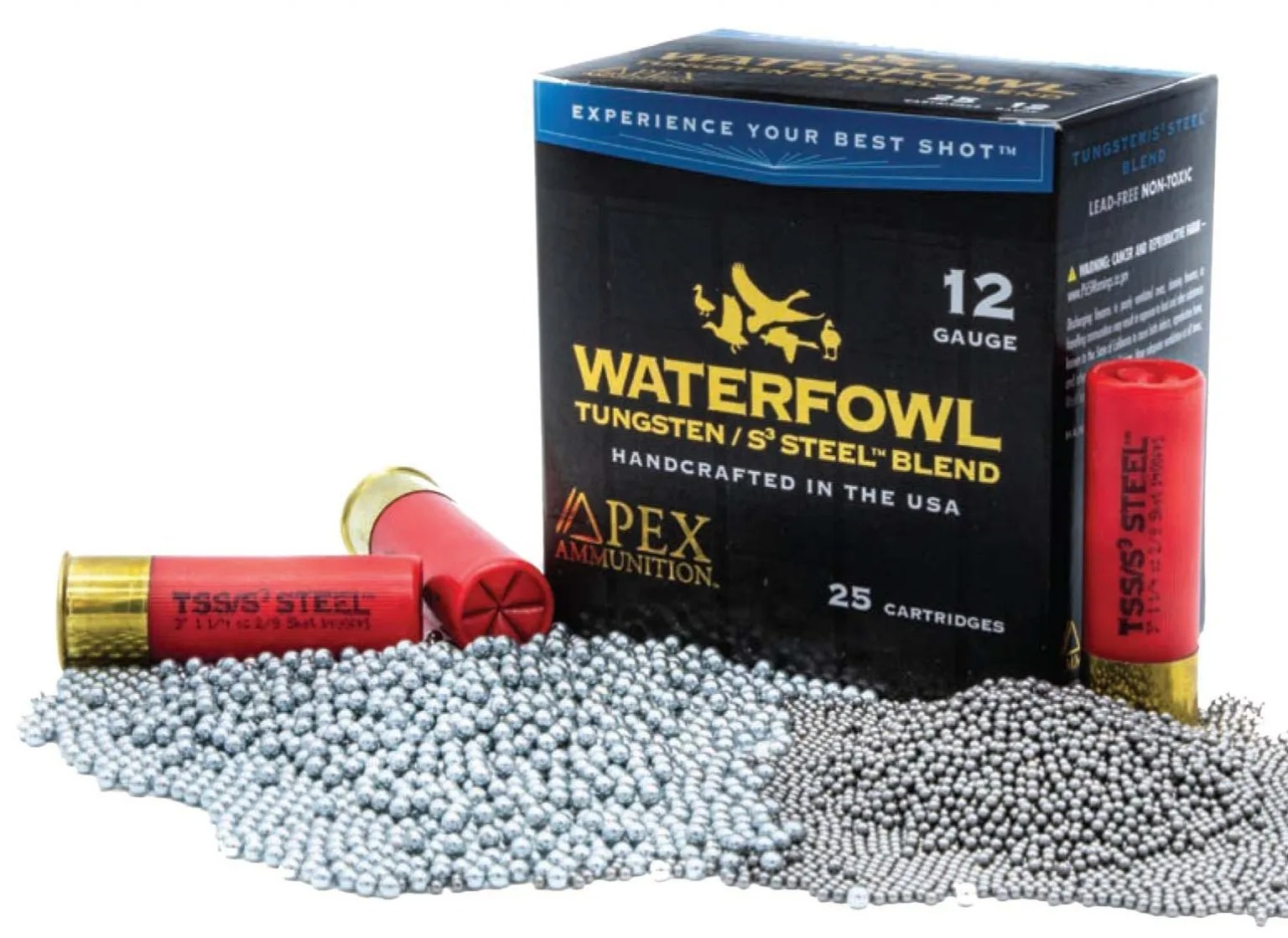 Линейка нетоксичных патронов премиум-класса компании Apex расширяется за счет выпуска новых смесей TSS/S3. Эти дуплексные патроны содержат высокоплотную дробь премиум-класса № 7,5 TSS с оцинкованной стальной дробью Apex. Дробь TSS имеет плотность 18,1 г/куб. см, что значительно выше, чем у свинца, и в сочетании с однородной оцинкованной стальной дробью Apex (№ 2, 4 или BB в 12 калибре, № 4 в 20 калибре) этот смешанный заряд обеспечивает превосходную летальность и снижает количество ранений. Эти патроны содержат порох высшего качества и цельные пыжи из вольфрама, которые защищают внутреннюю поверхность ствола, что делает их отличным вариантом для серьезных охотников на водоплавающую дичь.