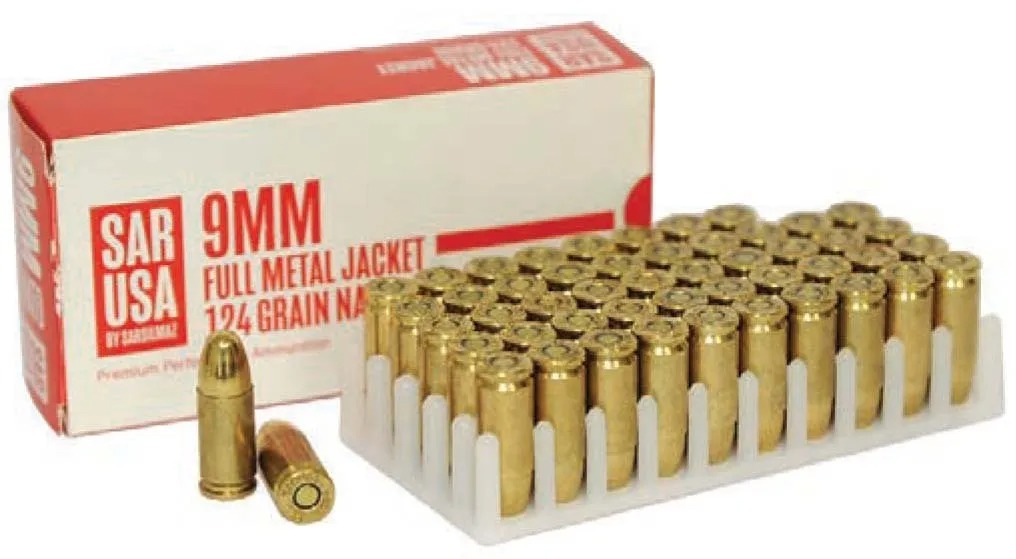 Производимые в Турции патроны SAR 9 mm NATO FMJ имеют латунную гильзу и герметичные праймеры военного класса. Патроны разработаны для обеспечения точности и эффективности стрельбы. Выпускаются в коробках по 50 патронов с 115-грейновой пулей FMJ или 124-грейновой пулей FMJ.
