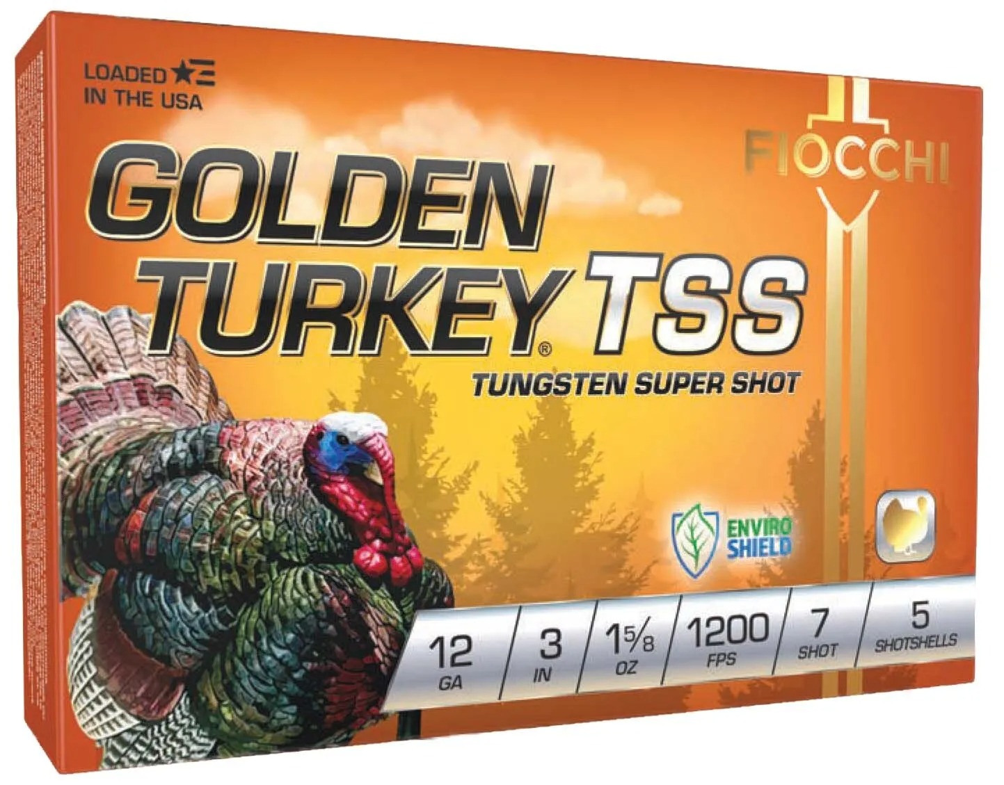 Заряды Golden Turkey TSS от Fiocchi обеспечивают высокую кучность, глубокое проникновение и дальнобойность при использовании вольфрамовой дроби 18 г/куб. см. Патроны 12-го калибра длиной 7,62 см выпускаются с дробью № 7 или № 9. Дульная скорость составляет 373,3 м/с. В ружьях 20-го калибра используется дробь № 9. Дульная скорость составляет 373,3 м/с. Для патронов калибра .410 также используется дробь № 9. Дульная скорость — 335,2 м/с. Все они поставляются в коробках по пять штук.